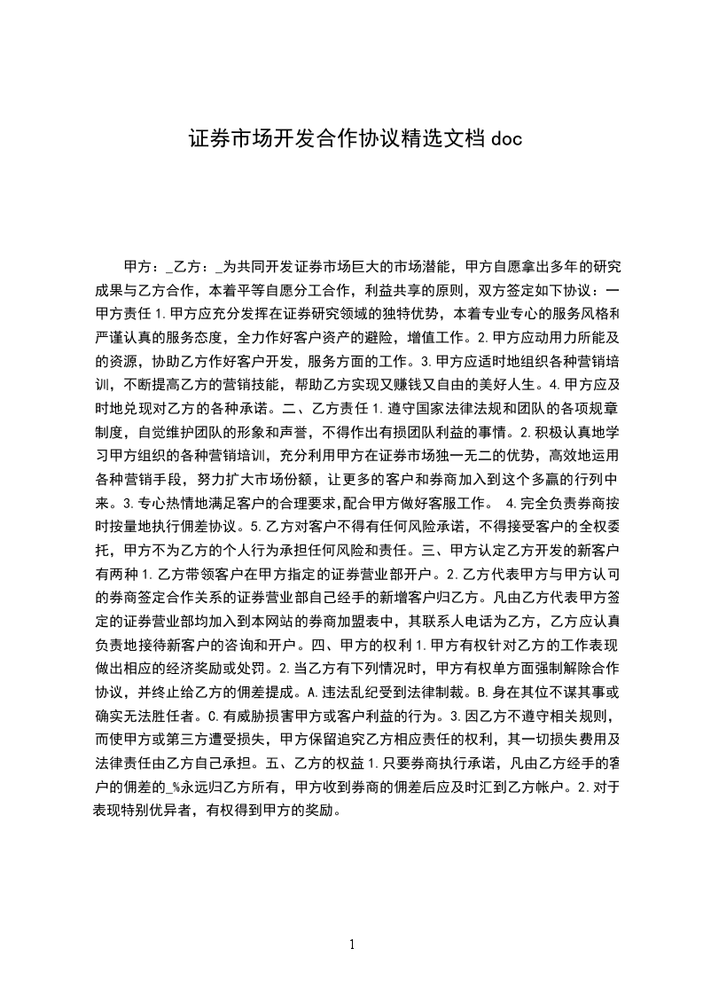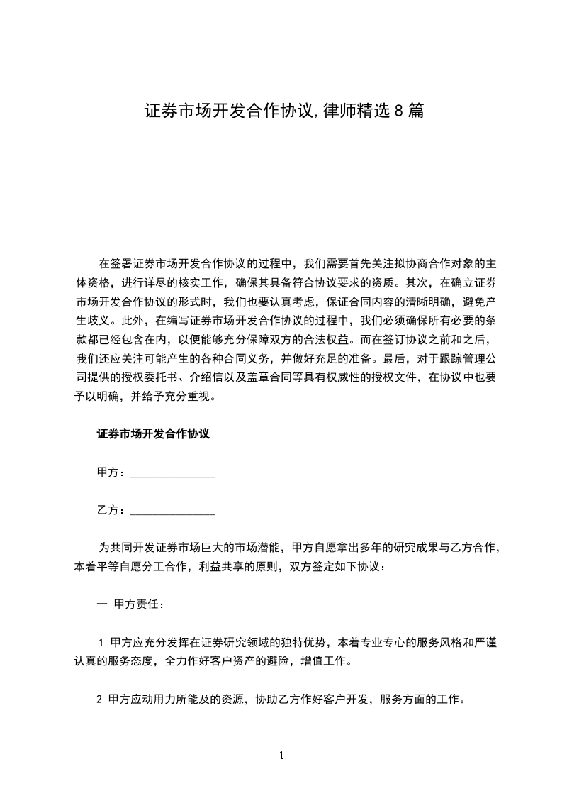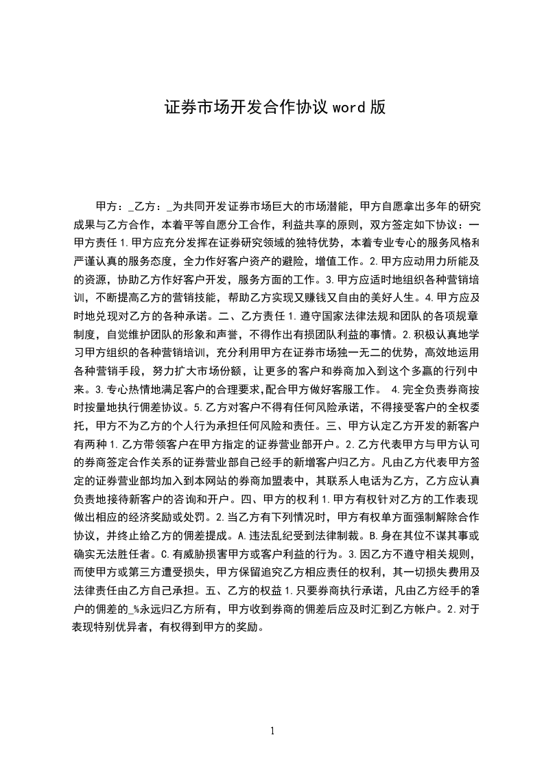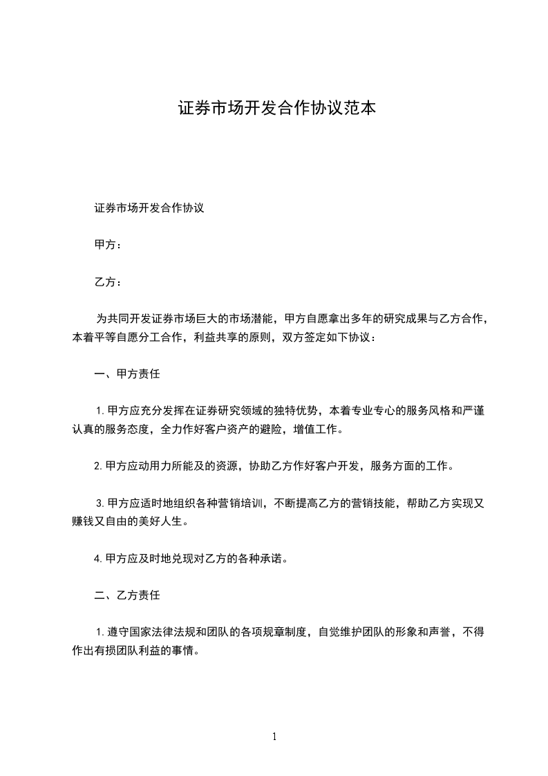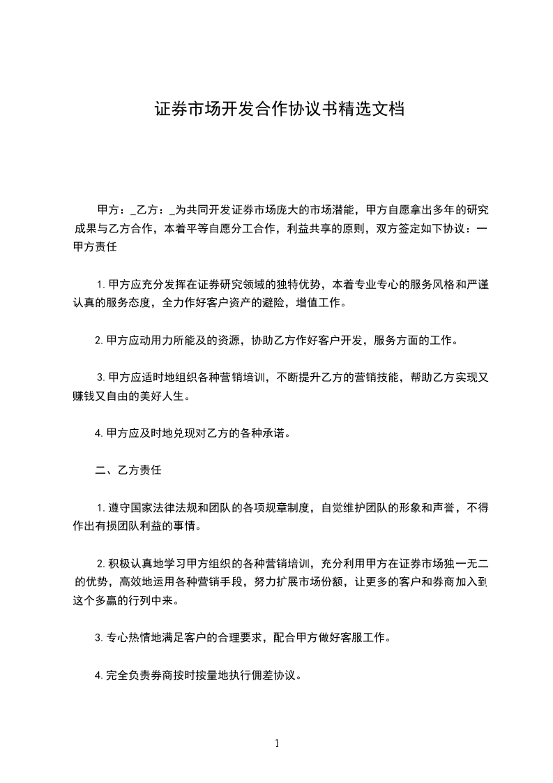 为共同开发证券市场巨大的市场潜能,甲方自愿拿出多年的研究成果与乙方合作,本着平等自愿分工合作,利益共享的原则,双方签定如下协议: