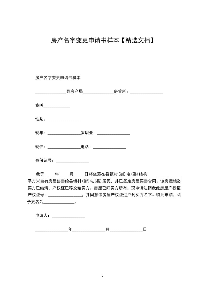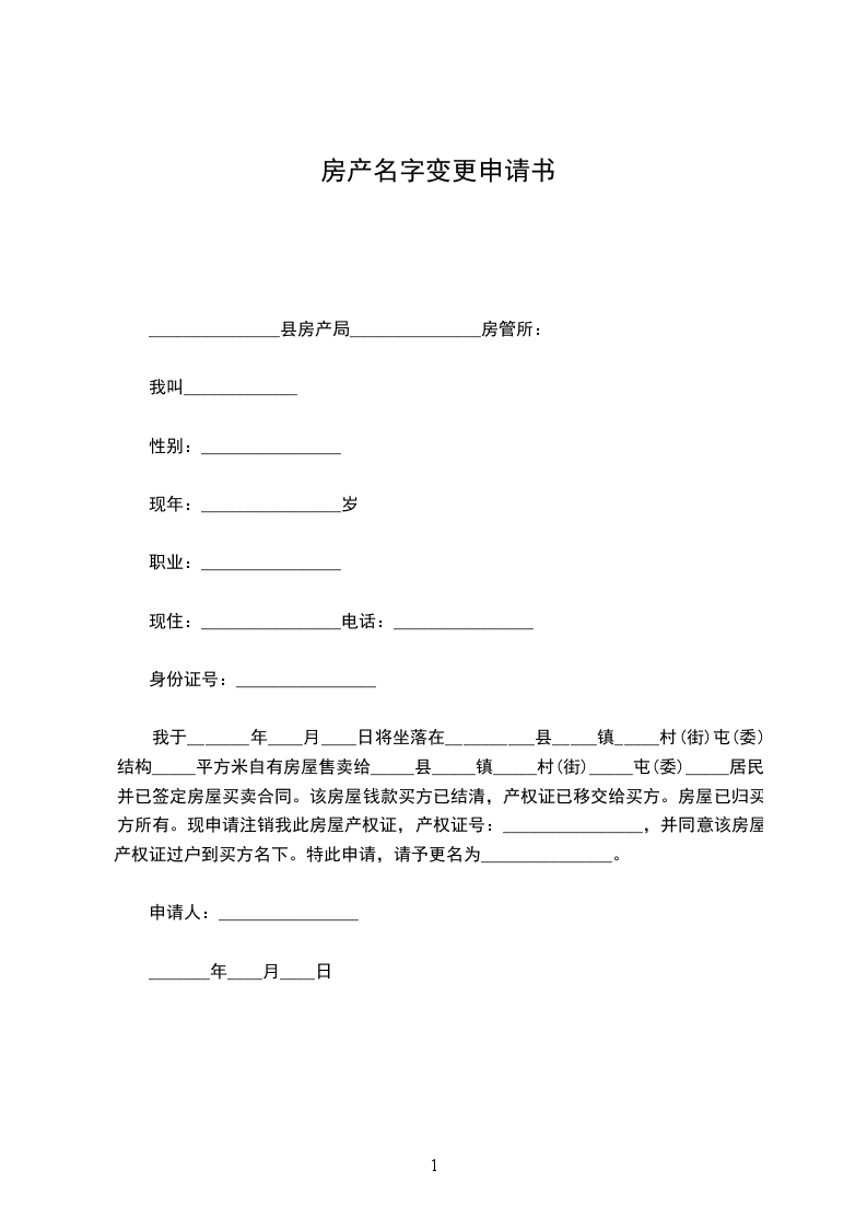 我于_______年____月____日将坐落在__________县_____镇_____村(街)屯(委)结构_____平方米自有房屋售卖给_____县_____镇_____村(街)_____屯(委)_____居民,并已签定房屋买卖合同。该房屋钱款买方已结清,产权证已移交给买方。房屋已归买方所有。现申请注销我此房屋产权证,产权证号:________________,并同意该房屋产权证过户到买方名下。特此申请,请予更名为_______________。