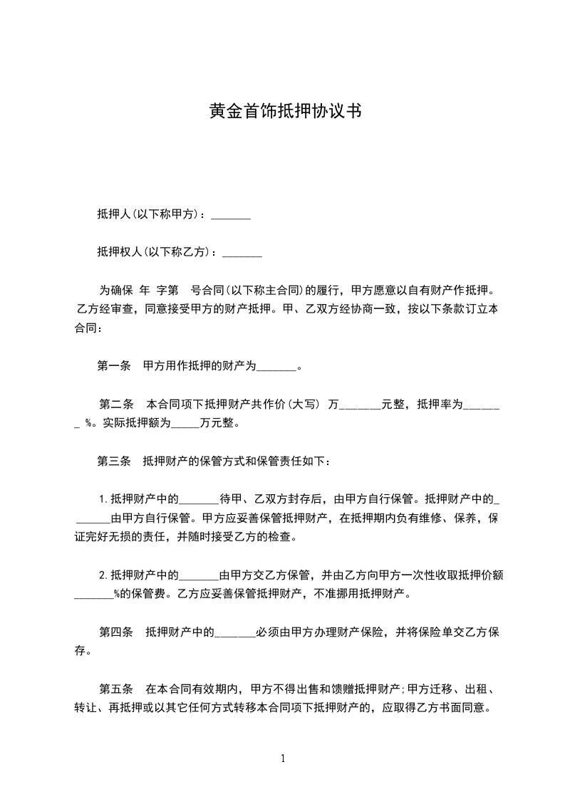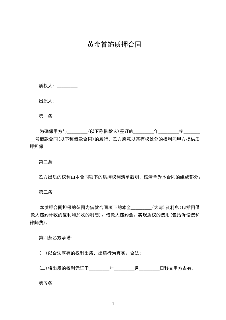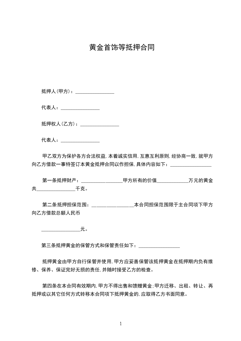第一条抵押财产:_________________甲方所有的价值_____________万元的黄金共________________千克。