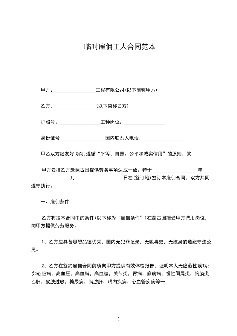 乙方将按本合同中的条件(以下称为“雇佣条件”)在蒙古国接受甲方聘用岗位,向甲方提供劳务服务。
