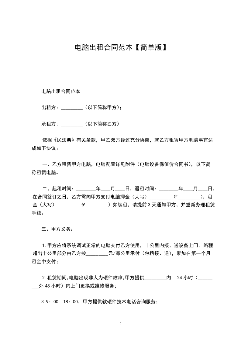 依据《民法典》有关条款,甲乙双方经过充分协商,就乙方租赁甲方电脑事宜达成如下协议: