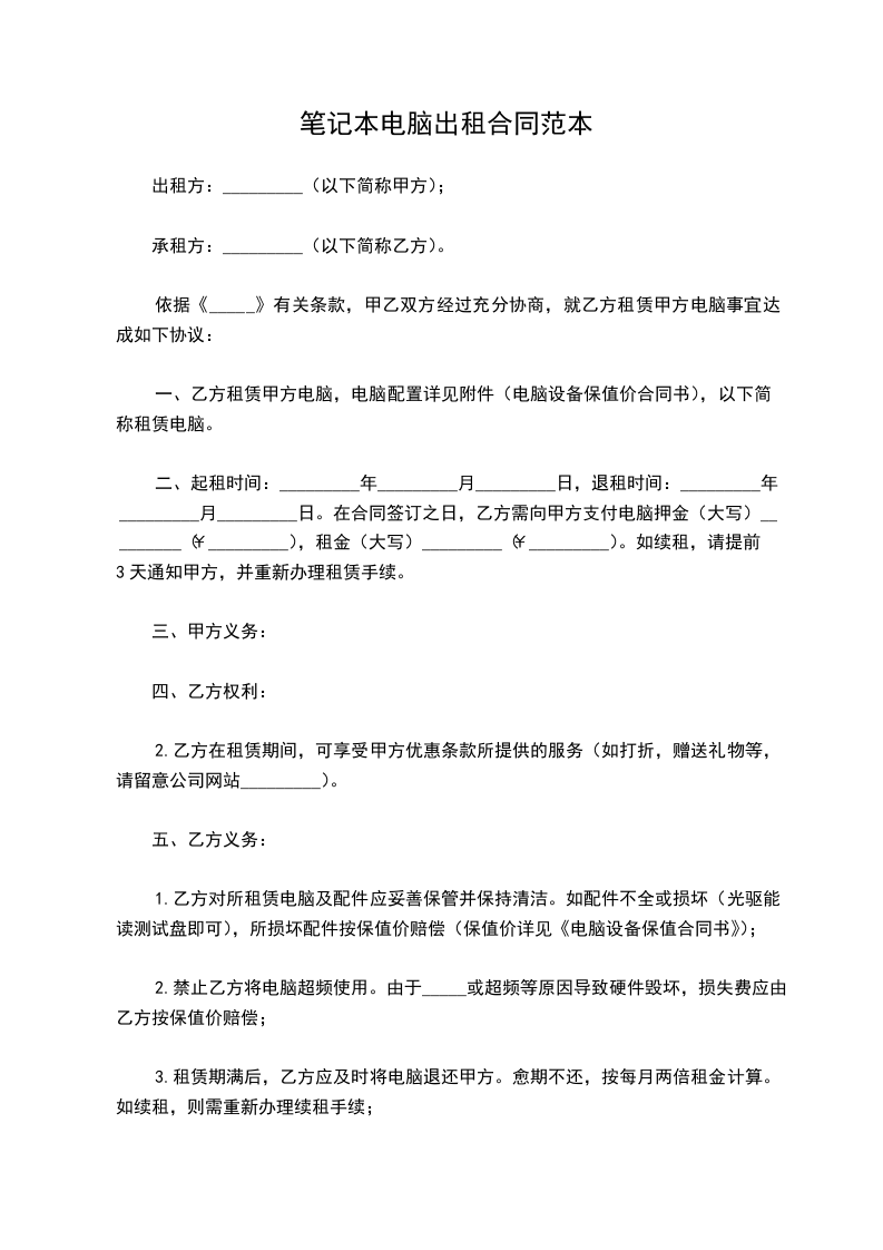 3.租赁期满后,乙方应及时将电脑退还甲方。愈期不还,按每月两倍租金计算。如续租,则需重新办理续租手续;