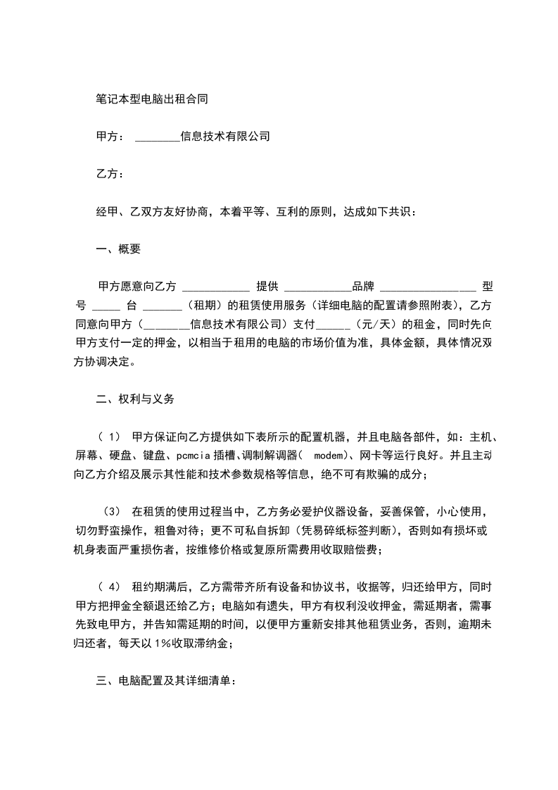 1.如乙方不按时缴纳租金,甲方有权在其押金中扣除,同时收回电脑,所有损失由乙方负责;