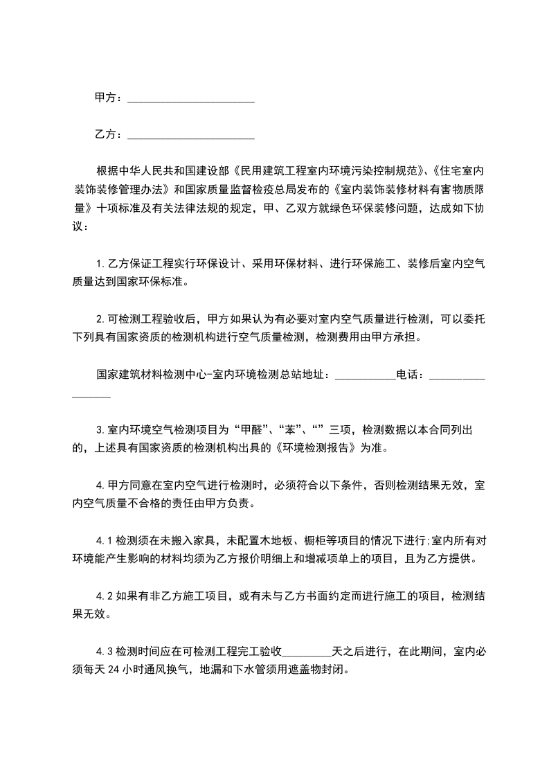 根据中华人民共和国建设部《民用建筑工程室内环境污染控制规范》、《住宅室内装饰装修管理办法》和国家质量监督检疫总局发布的《室内装饰装修材料有害物质限量》十项标准及有关法律法规的规定,甲、乙双方就绿色环保装修问题,达成如下协议: