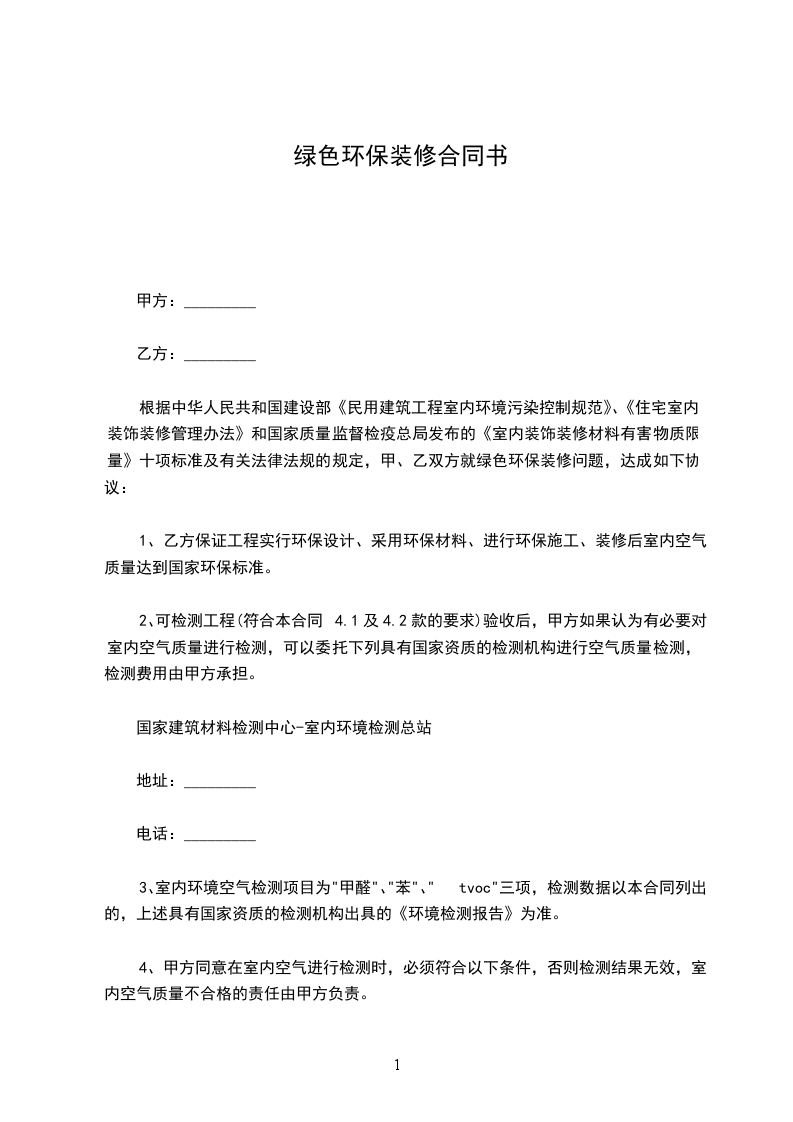 1 、乙方保证工程实行环保设计、采用环保材料、进行环保施工、装修后室内空气质量达到国家环保标准。