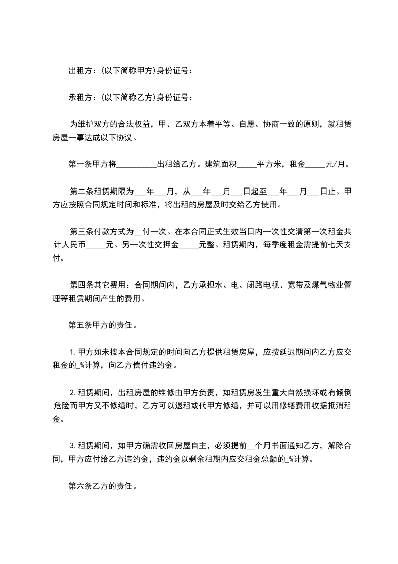 第一条甲方将__________出租给乙方。建筑面积_____平方米,租金_____元/月。