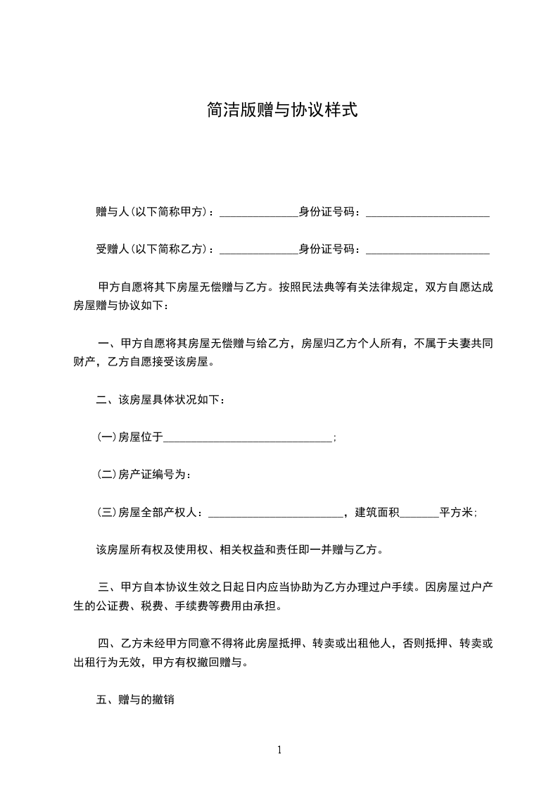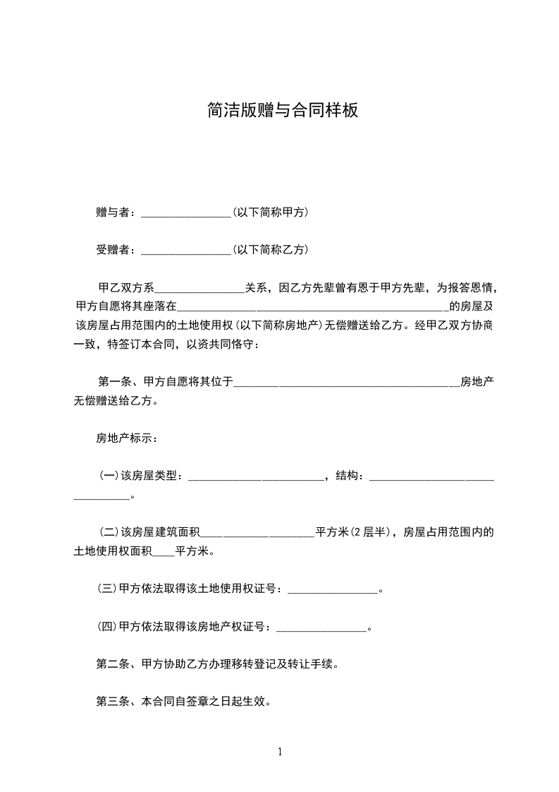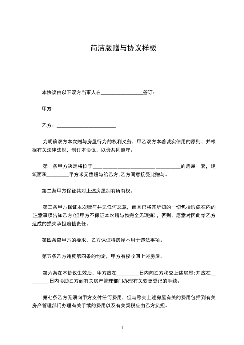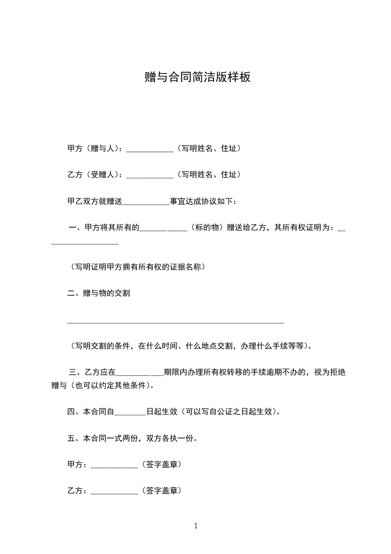 一、甲方将其所有的____________(标的物)赠送给乙方,其所有权证明为:___________________