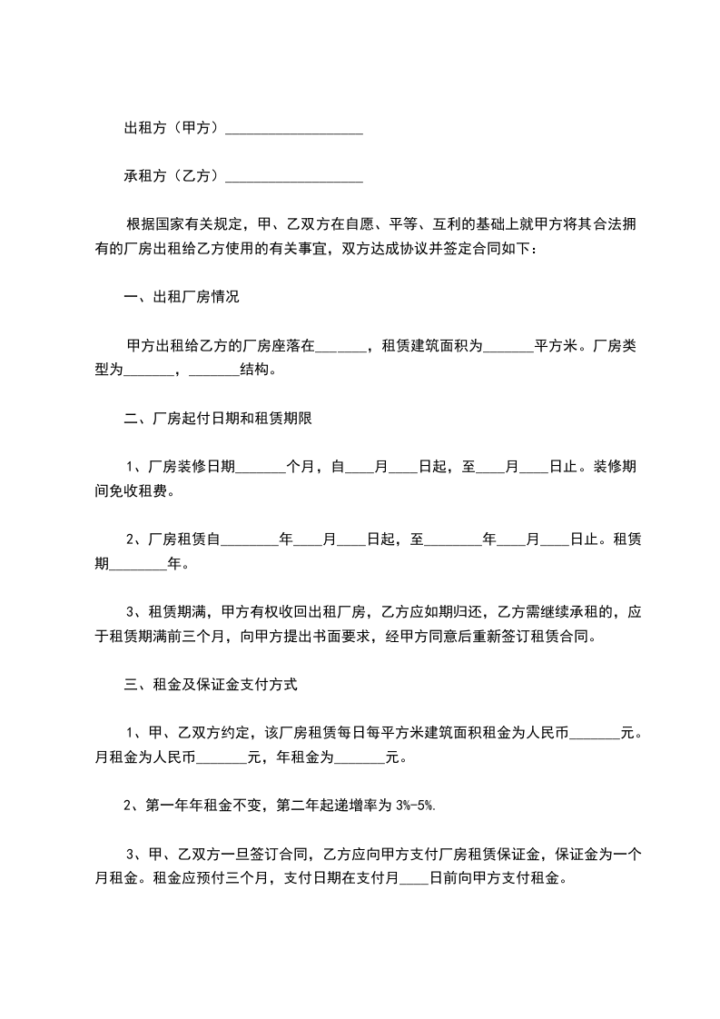 2、厂房租赁自________年____月____日起,至________年____月____日止。租赁期________年。