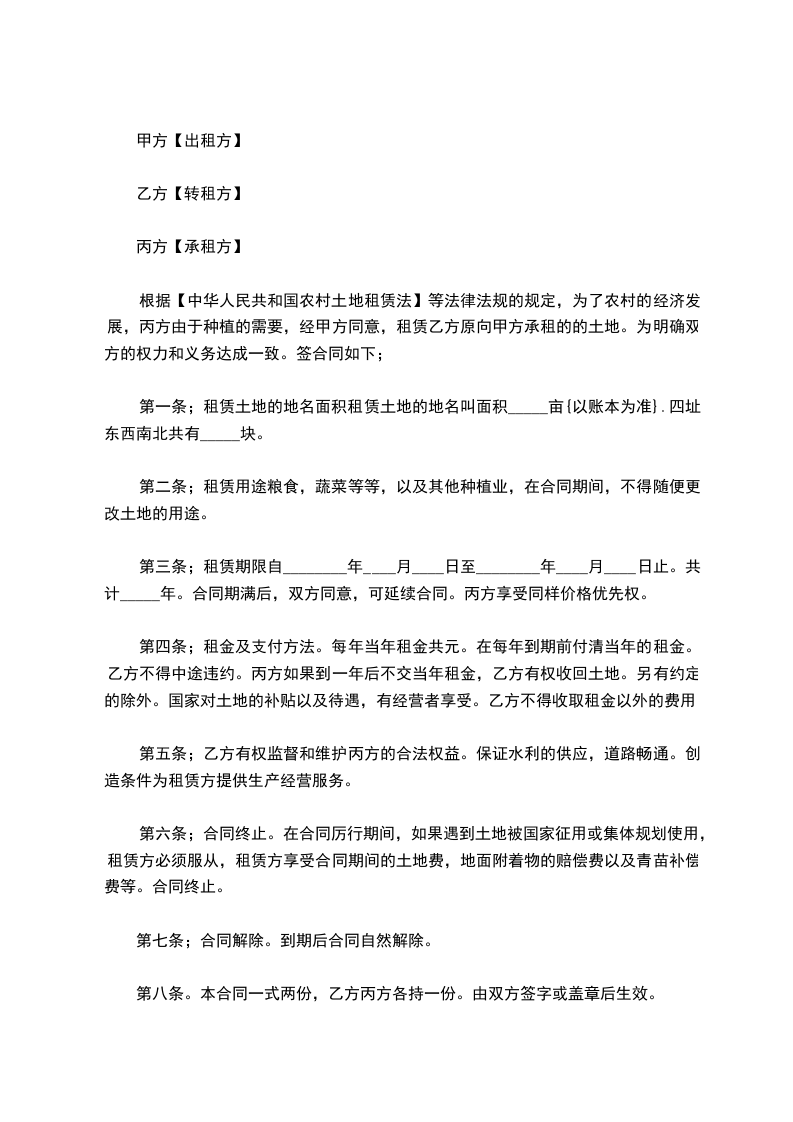 根据【中华人民共和国农村土地租赁法】等法律法规的规定,为了农村的经济发展,丙方由于种植的需要,经甲方同意,租赁乙方原向甲方承租的的土地。为明确双方的权力和义务达成一致。签合同如下;