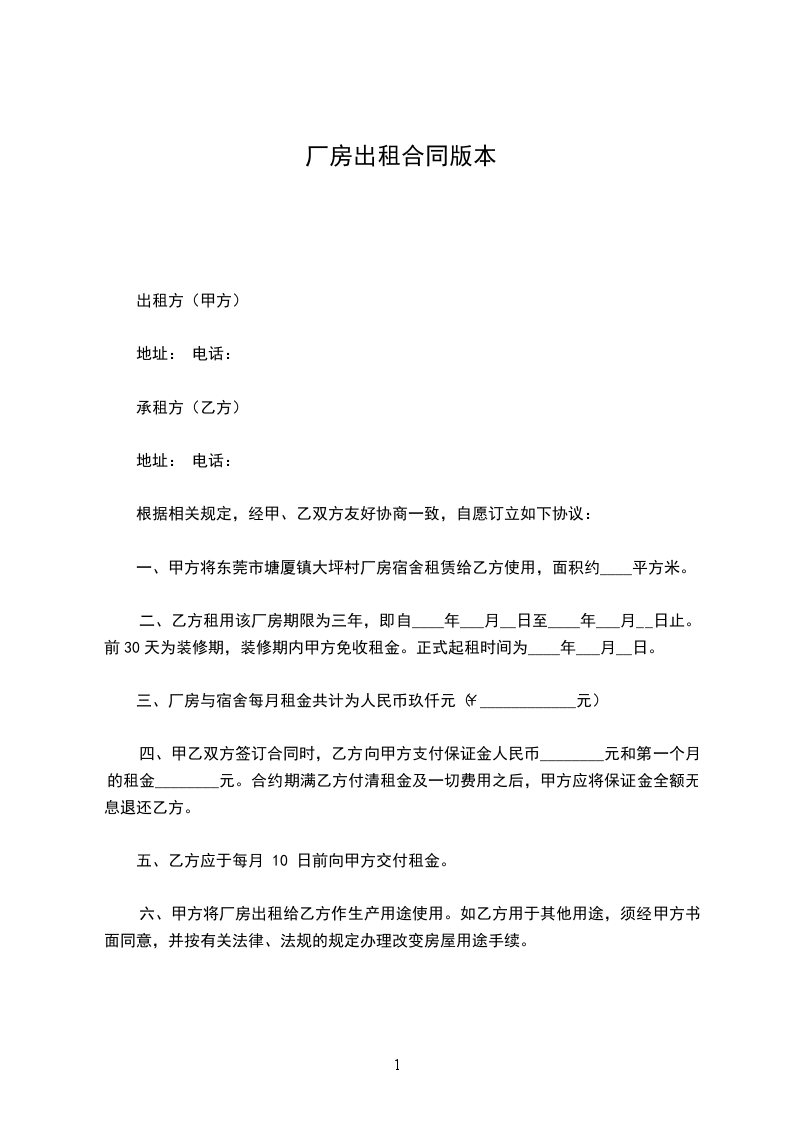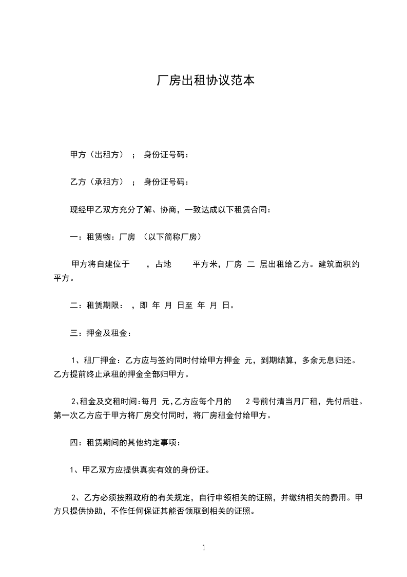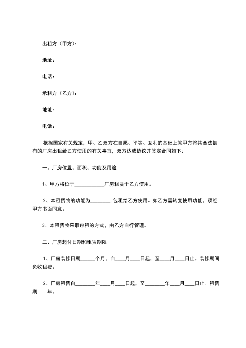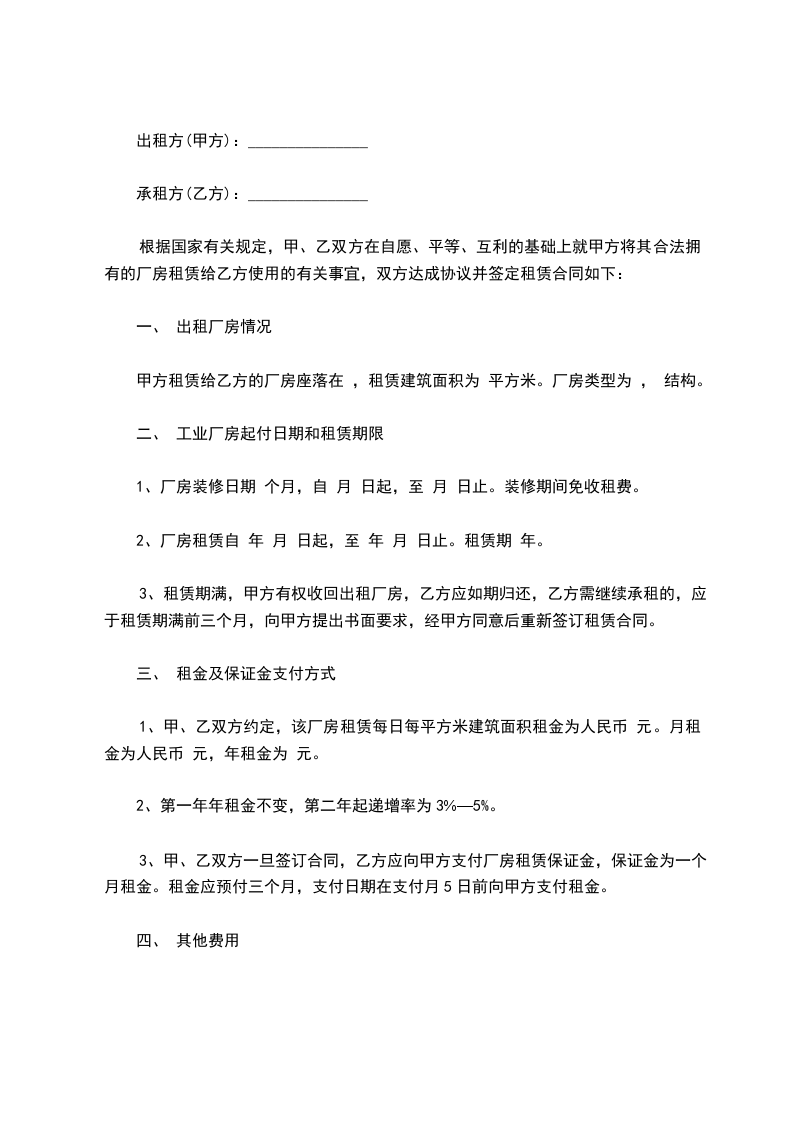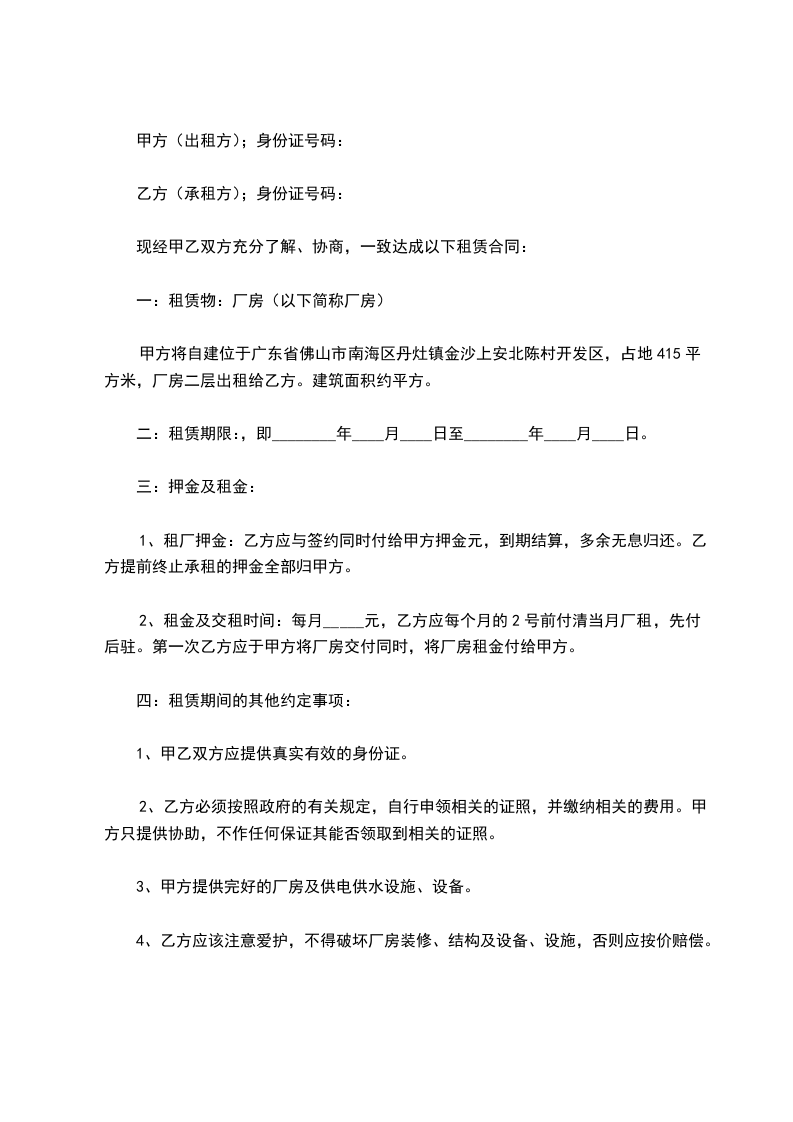 1、租厂押金:乙方应与签约同时付给甲方押金元,到期结算,多余无息归还。乙方提前终止承租的押金全部归甲方。