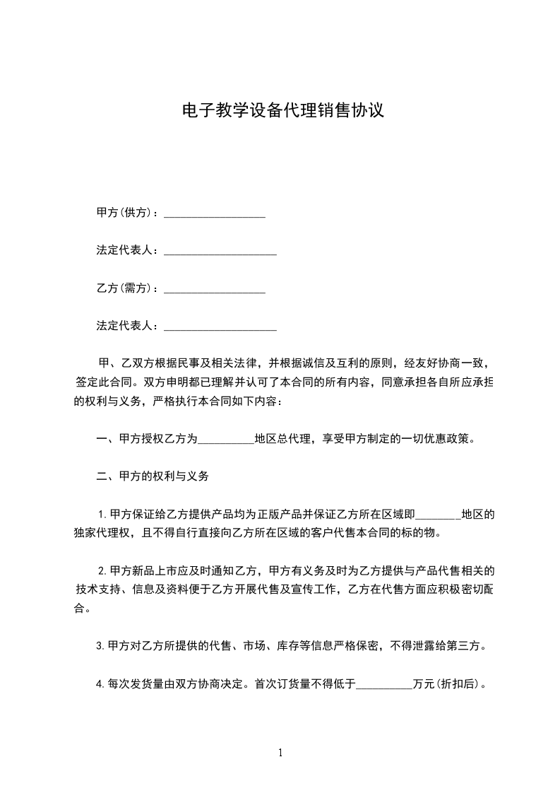 B,订单额在____________至____________之间(每次付款需全额付款,严禁赊欠)按照区域销售站政策对待,即首次订单买一赠一,其中首次货物按照实际货款额数量发货,赠品随二次订单发送,二次订单买二送一,赠品随第三次订单发送,三次订单买三赠一,赠品随第四次订单发货。甲方可以在乙方所在县区建立新的销售站。