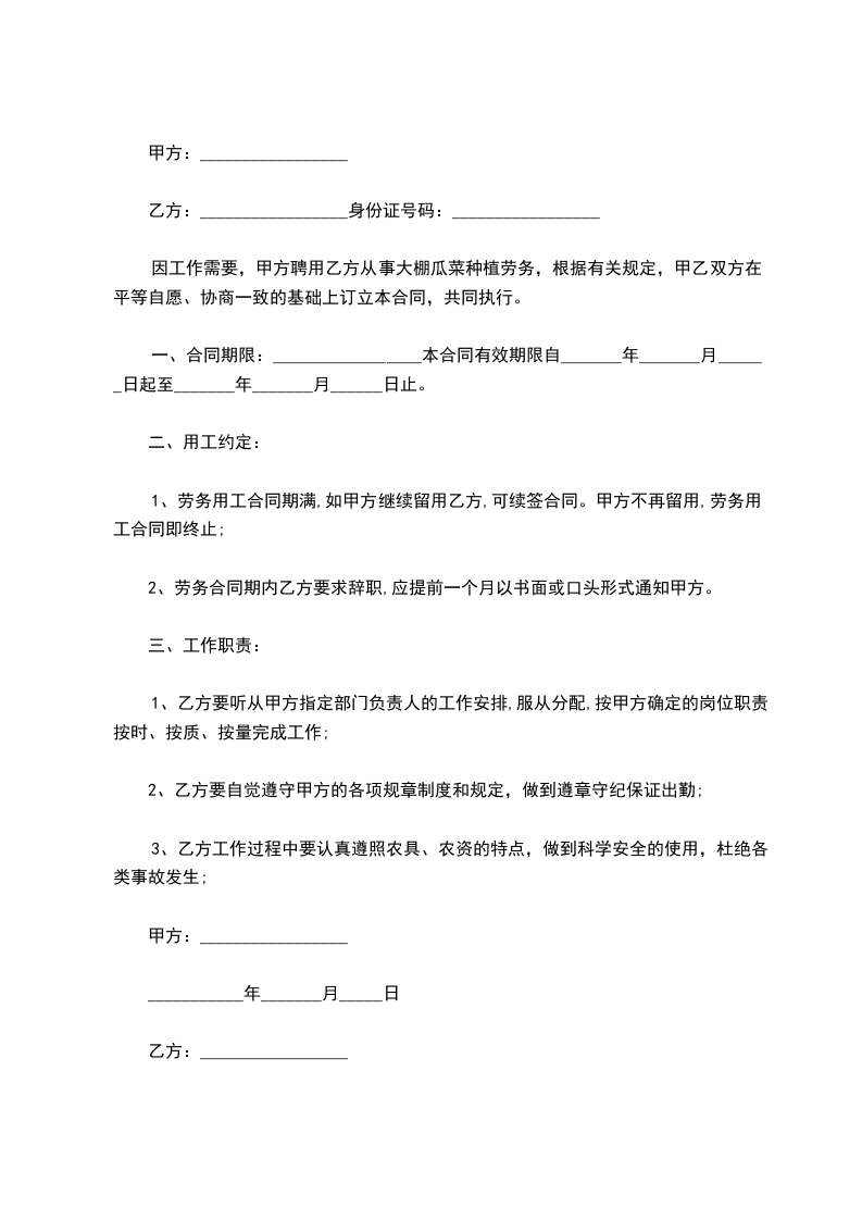因工作需要,甲方聘用乙方从事大棚瓜菜种植劳务,根据有关规定,甲乙双方在平等自愿、协商一致的基础上订立本合同,共同执行。
