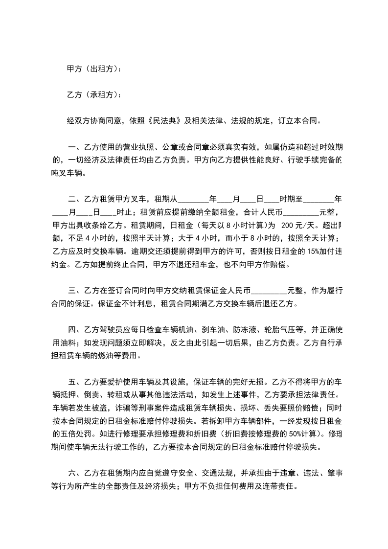 二、乙方租赁甲方叉车,租期从________年____月____日____时期至________年____月____日____时止;租赁前应提前缴纳全额租金,合计人民币_________元整,甲方出具收条给乙方。租赁期间,日租金(每天以8小时计算)为200元/天。超出限额,不足4小时的,按照半天计算;大于4小时,而小于8小时的,按照全天计算;乙方应及时交换车辆。逾期交还须提前得到甲方的许可,否则按日租金的15%加付违约金。乙方如提前终止合同,甲方不退还租车金,也不向甲方作赔偿。
