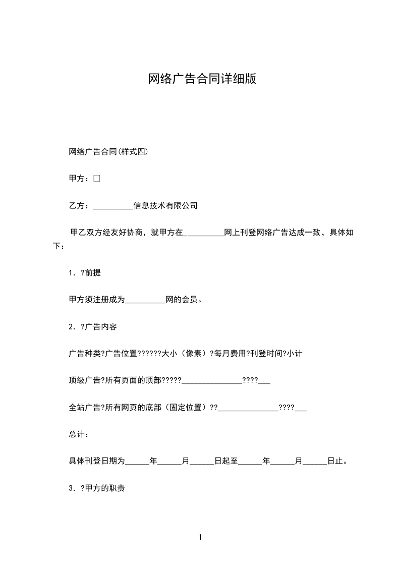甲方须在______年______月______日前付清全部广告款项;若需续期,请提前______天月通知乙方。若因乙方网络故障服务中断,乙方按照中断的时间加倍顺延服务期。