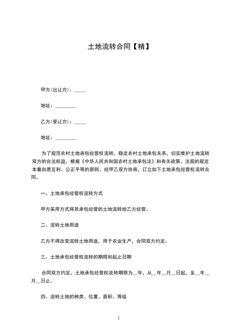 一、转让标的甲方将其承包经营的_____________乡(镇)_____________村_____________组_____________亩土地(地块名称、等级、四至、土地用途附后)的承包经营权转让给乙方从事_____________(主营项目)生产经营.