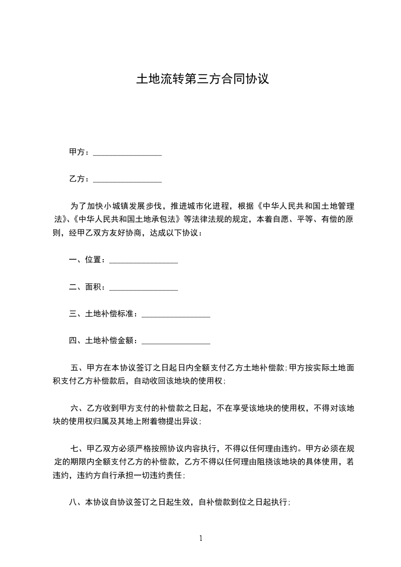 三、转让价格转让的土地承包经营权的转让金为_____________元人民币.甲方承包经营相关地块时对该地块实际投入资金和人力改造的,可收取合理的补偿金.本合同的补偿金为_____________元(没有补偿金时可填写为零元).两项合计总金额为_____________元人民币.