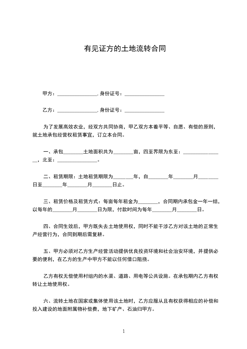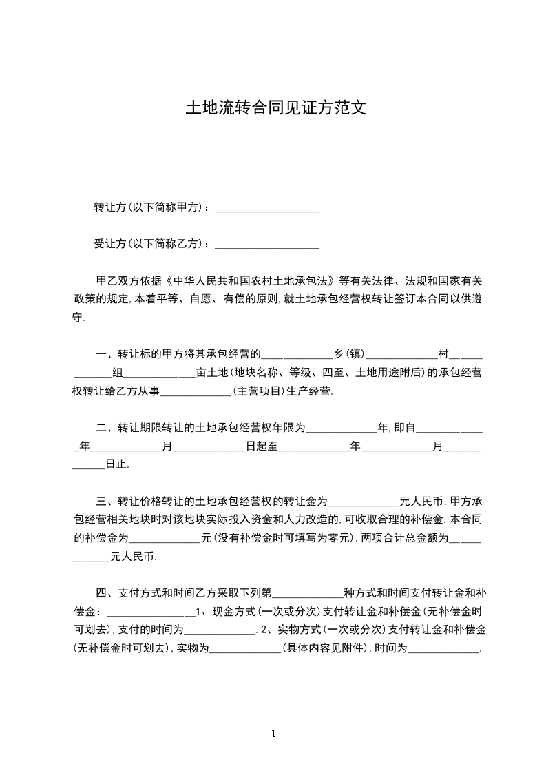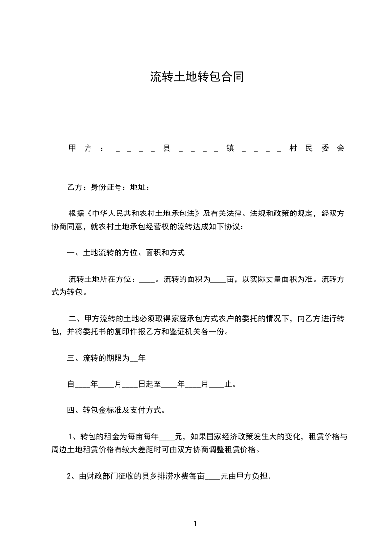 三、转让价格转让的土地承包经营权的转让金为_____________元人民币.甲方承包经营相关地块时对该地块实际投入资金和人力改造的,可收取合理的补偿金.本合同的补偿金为_____________元(没有补偿金时可填写为零元).两项合计总金额为_____________元人民币.