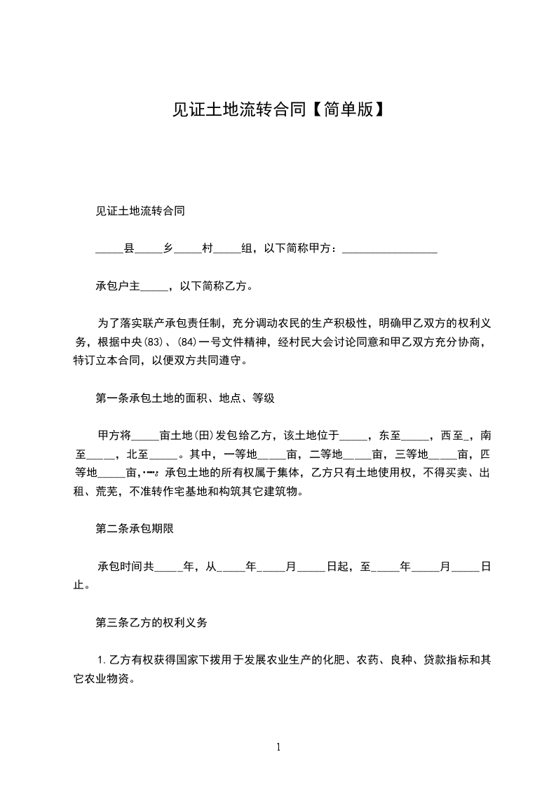 一、转让标的甲方将其承包经营的_____________乡(镇)_____________村_____________组_____________亩土地(地块名称、等级、四至、土地用途附后)的承包经营权转让给乙方从事_____________(主营项目)生产经营.