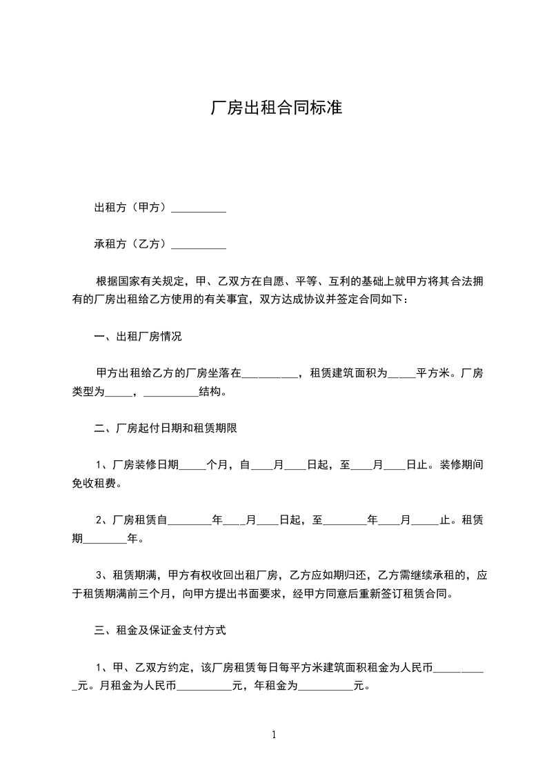 1、甲、乙双方约定,该厂房租赁每日每平方米建筑面积租金为人民币__________元。月租金为人民币__________元,年租金为__________元。
