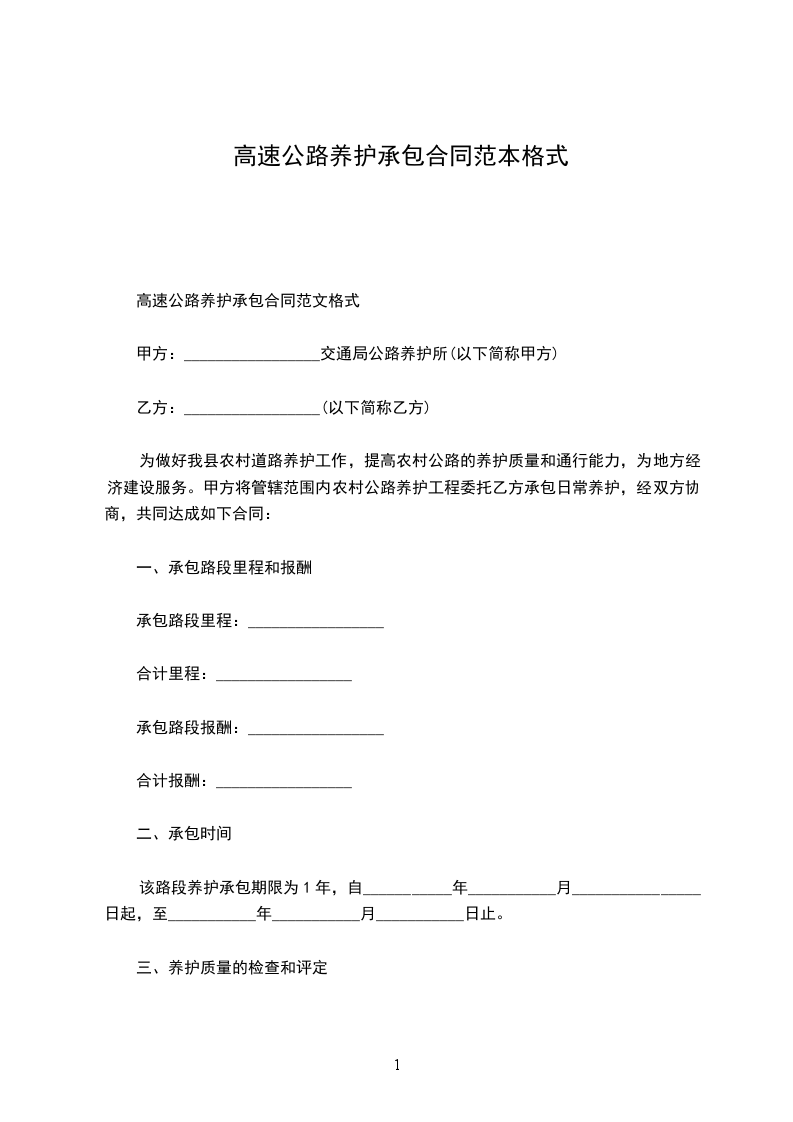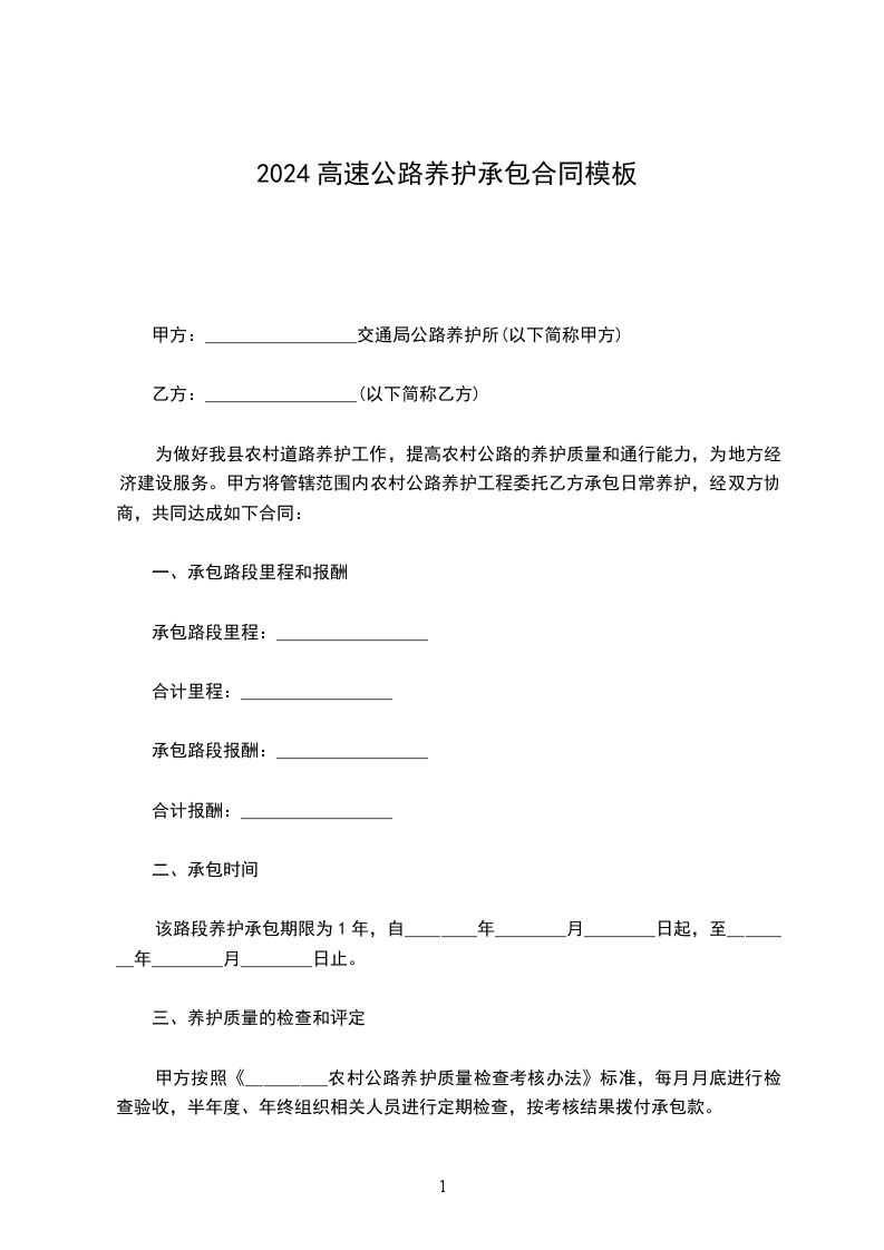 该路段养护承包期限为1年,自___________年___________月________________日起,至___________年___________月___________日止。
