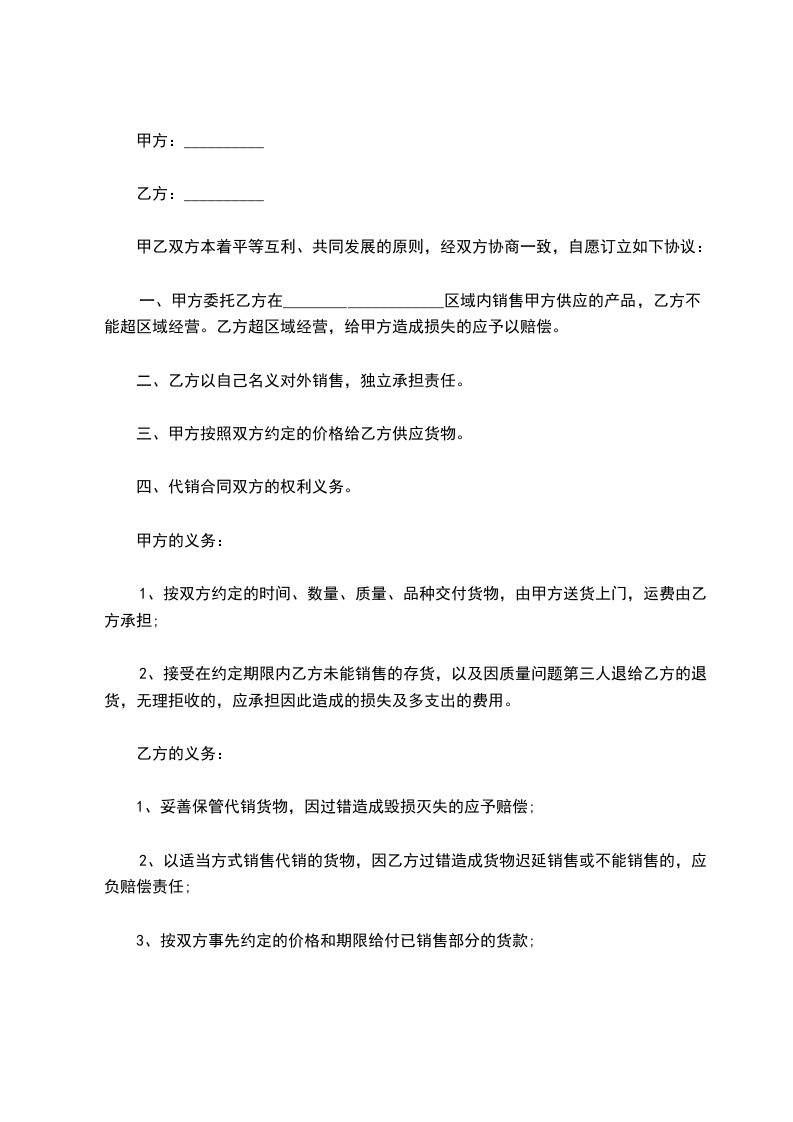 一、甲方委托乙方在____________________区域内销售甲方供应的产品,乙方不能超区域经营。乙方超区域经营,给甲方造成损失的应予以赔偿。