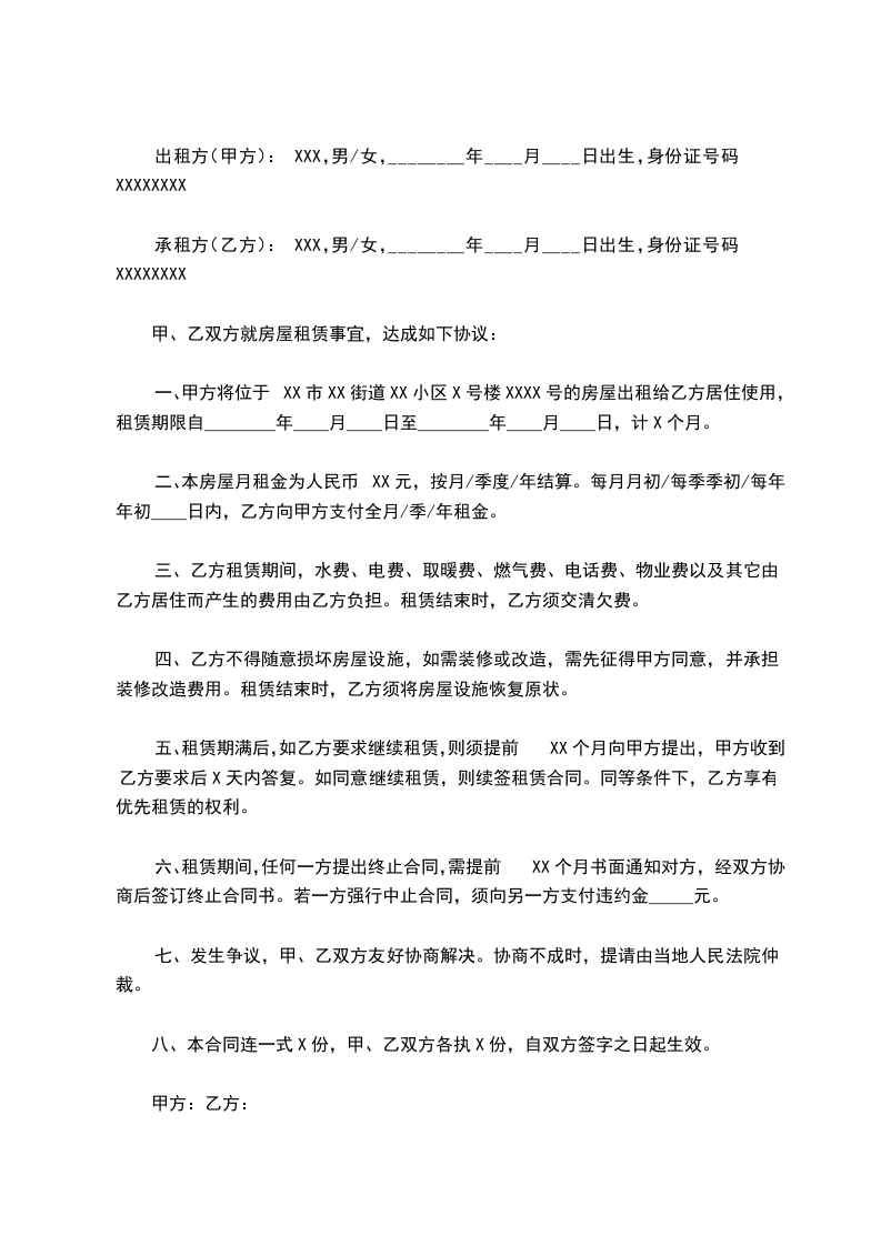 出租方(甲方):XXX,男/女,________年____月____日出生,身份证号码XXXXXXXX