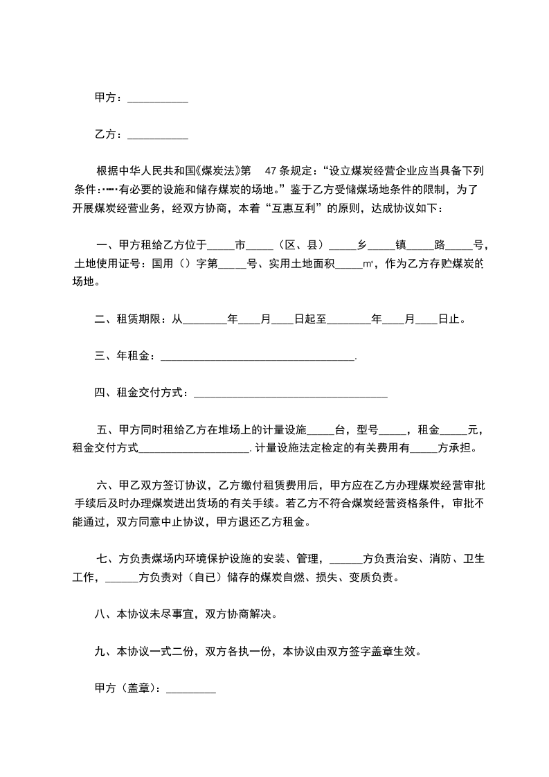 一、甲方租给乙方位于_____市_____(区、县)_____乡_____镇_____路_____号,土地使用证号:国用()字第_____号、实用土地面积_____㎡,作为乙方存贮煤炭的场地。