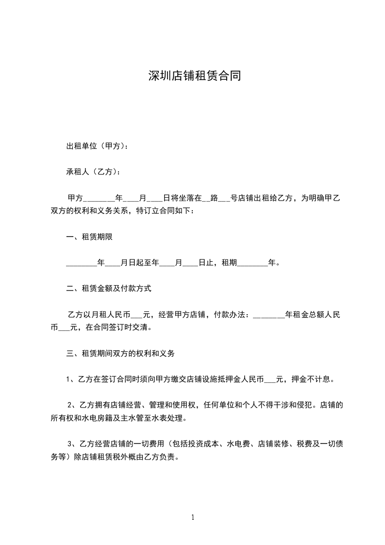 1、乙方在签订合同时须向甲方缴交店铺设施抵押金人民币___元,押金不计息。
