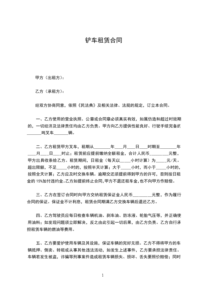 一、乙方使用的营业执照、公章或合同章必须真实有效,如属仿造和超过时效期的,一切经济及法律责任均由乙方负责。甲方向乙方提供性能良好、行驶手续完备的_______吨叉车_______辆。