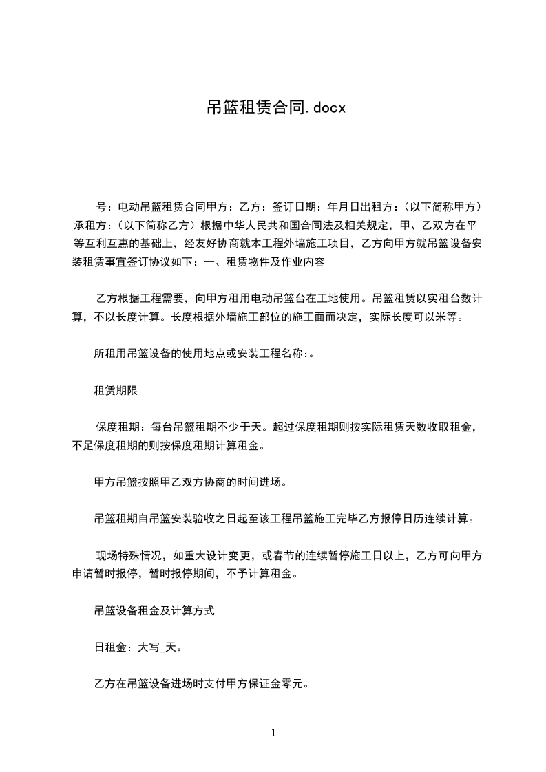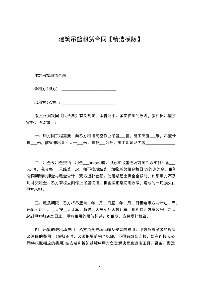 一、甲方因工程需要,向乙方租用高空作业吊篮___套,施工高度___米,吊篮长度___米,前梁伸出量不大于___米,限载___公斤,施工地址及内容_____________________________________________