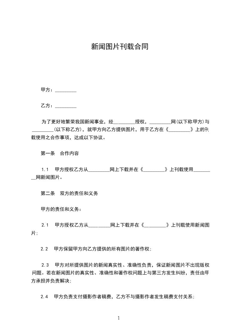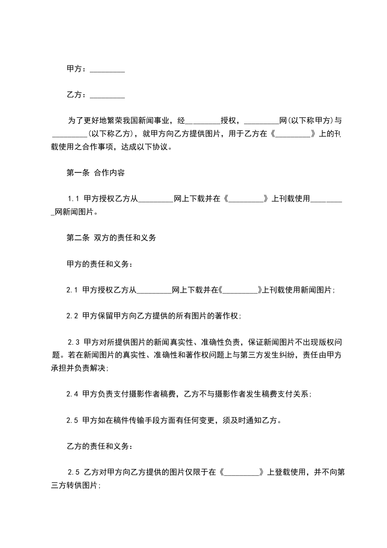 为了更好地繁荣我国新闻事业,经_________授权,_________网(以下称甲方)与_________(以下称乙方),就甲方向乙方提供_____,用于乙方在《_________》上的刊载使用之合作事项,达成以下协议。