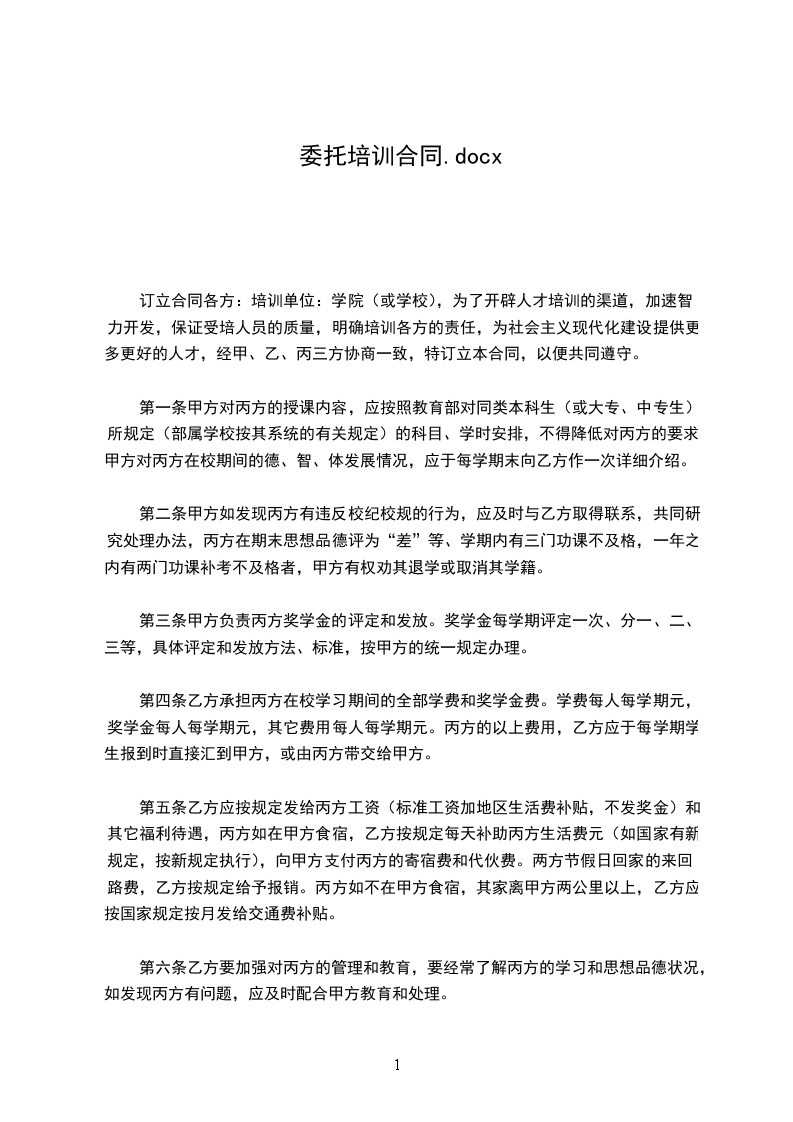 为了开辟人才培训的渠道,加速智力开发,保证受培人员的质量,明确培训各方的责任,为社会主义现代化建设提供更多更好的人才,经甲、乙、丙三方协商一致,特订立本合同,以便共同遵守。