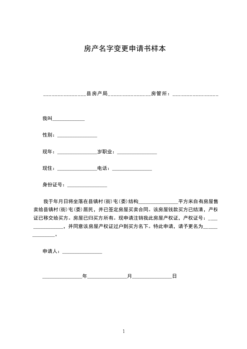 我于_____年_____月_____日将坐落在县镇村(街)屯(委)结构________________平方米自有房屋售卖给县镇村(街)屯(委)居民,并已签定房屋买卖合同。该房屋钱款买方已结清,产权证已移交给买方。房屋已归买方所有。现申请注销我此房屋产权证,产权证号:________________,并同意该房屋产权证过户到买方名下。特此申请,请予更名为_______________。