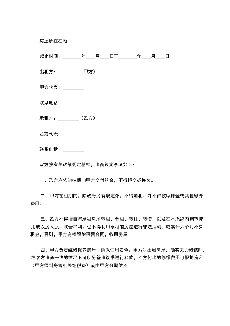 五、租赁期间,乙方不得擅自改变房屋结构、用途。因业务或其他原因需要拆改、添建或改装门面、室内装饰等,应事先征得甲方同意,议定今后处理办法,并另签协议(一式三份,其中一份报房管部门备案)。
