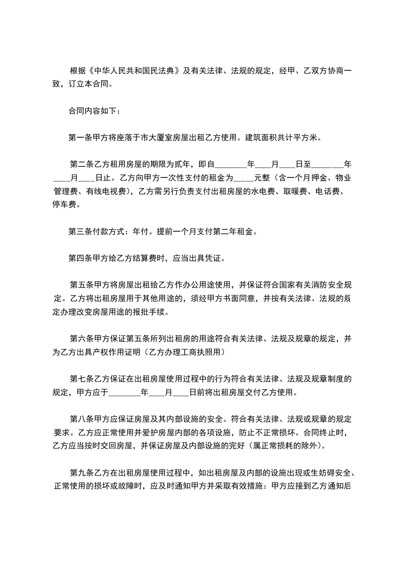 第一条甲方将座落于市大厦室房屋出租乙方使用。建筑面积共计平方米。
