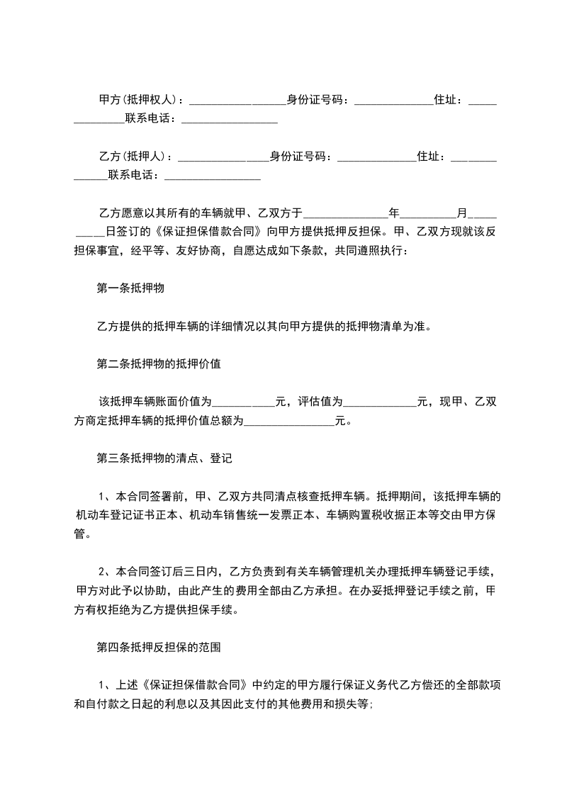 乙方愿意以其所有的车辆就甲、乙双方于_______________年__________月__________日签订的《保证担保借款合同》向甲方提供抵押反担保。甲、乙双方现就该反担保事宜,经平等、友好协商,自愿达成如下条款,共同遵照执行:
