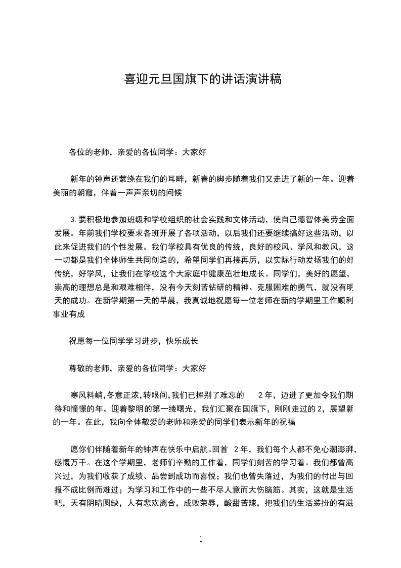 寒风料峭,冬意正浓,转眼间,我们已挥别了难忘的2年,迈进了更加令我们期待和憧憬的年。迎着黎明的第一缕曙光,我们汇聚在国旗下,刚刚走过的2,展望新的一年。在此,我向全体敬爱的老师和亲爱的同学们表示新年的祝福