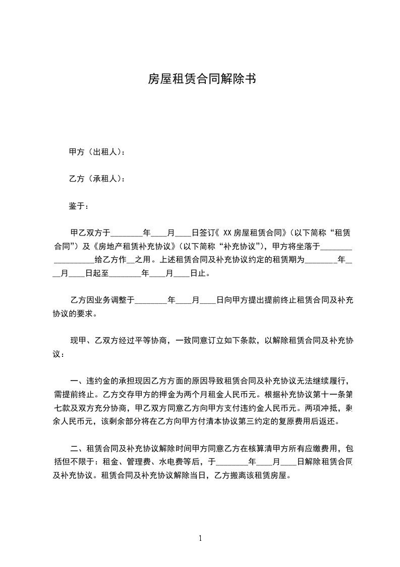 二、租赁合同及补充协议解除时间甲方同意乙方在核算清甲方所有应缴费用,包括但不限于:租金、管理费、水电费等后,于________年____月____日解除租赁合同及补充协议。租赁合同及补充协议解除当日,乙方搬离该租赁房屋。