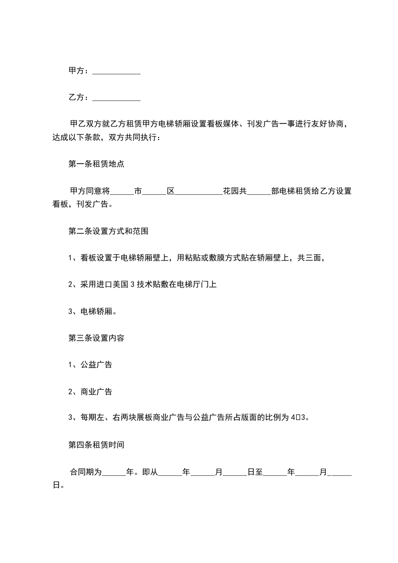 甲方同意将市区花园(大厦/小区)共部电梯租赁给乙方设置看板,刊发广告。