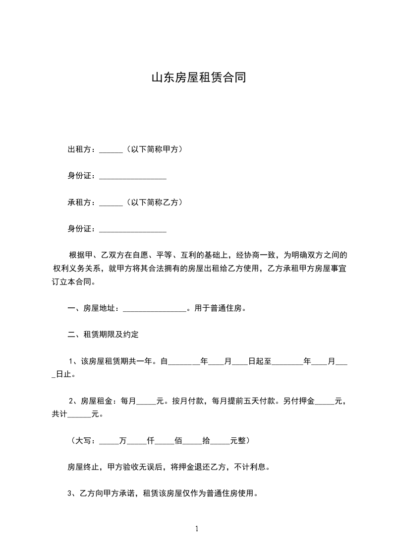 1、该房屋租赁期共一年。自________年____月____日起至________年____月____日止。