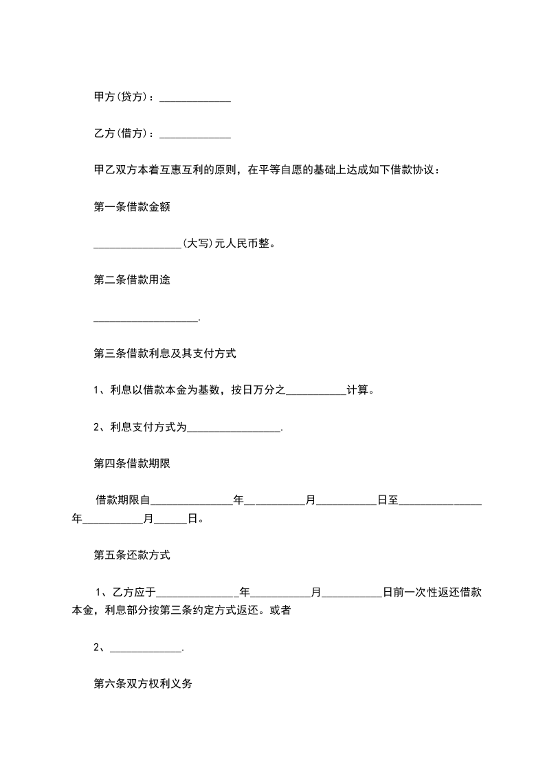 1、甲方应于_______________年___________月___________日前一次性提供给乙方合同约定的借款数额。