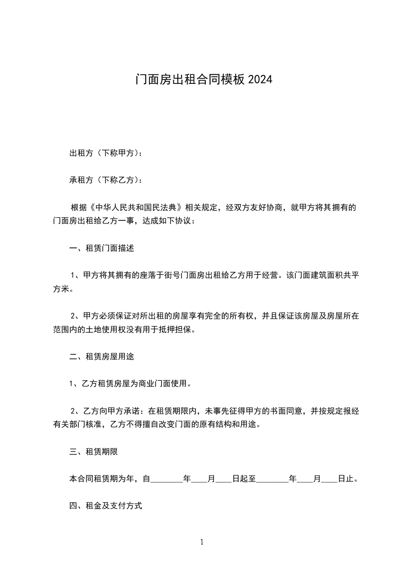 根据《中华人民共和国民法典》相关规定,经双方友好协商,就甲方将其拥有的门面房出租给乙方一事,达成如下协议: