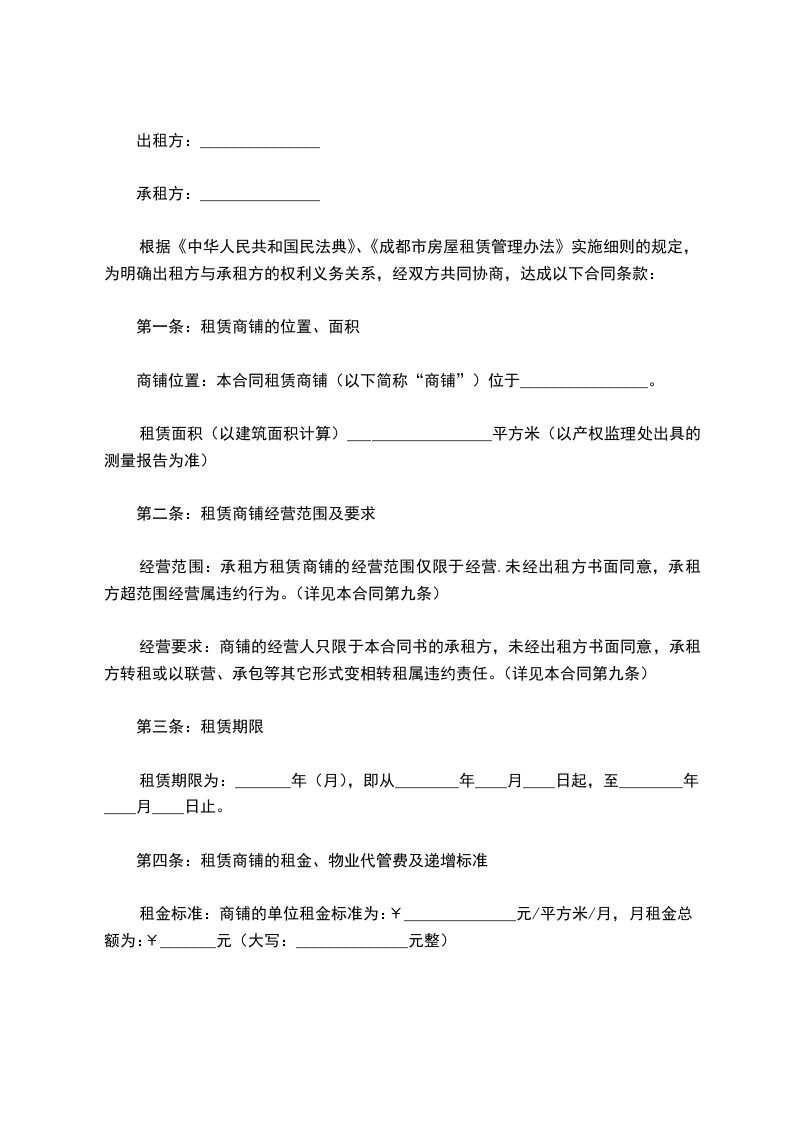 根据《中华人民共和国民法典》、《成都市房屋租赁管理办法》实施细则的规定,为明确出租方与承租方的权利义务关系,经双方共同协商,达成以下合同条款: