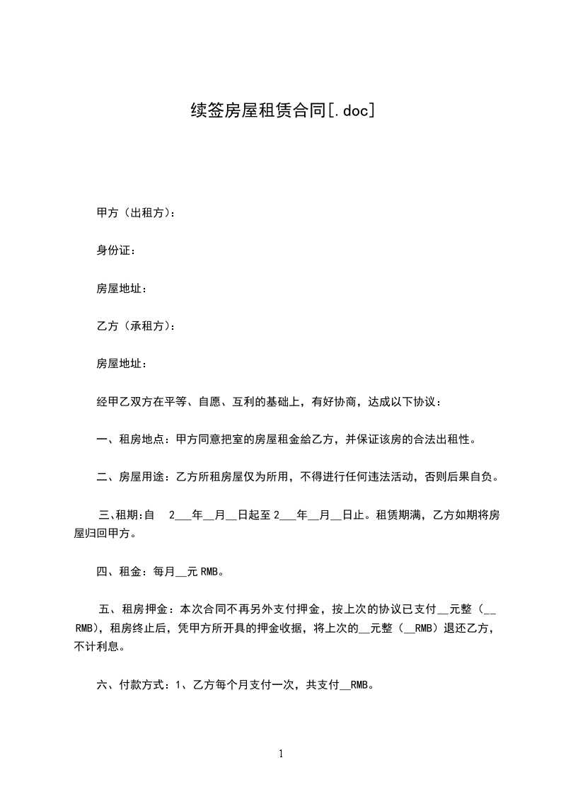 二、乙方承租甲方房屋作居住使用,续租时间自________年____月____日起至________年____月____日止。该房屋租金为每月_____元整,缴租方式为支付一次,计人民币,下次付款提前天支付,如不支付,即属违约。