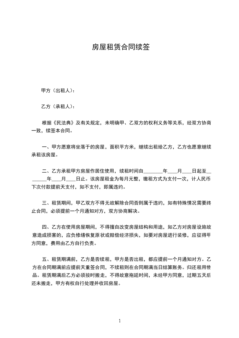 五、租赁期满前,乙方是否续租,甲方是否出租,都应提前一个月通知对方。乙方在合同期满前应提前天重签合同,不续租则在合同期满当日结算账务。归还租用物品。租赁期满后乙方必须按时搬走,不得故意拖延时间,未经甲方同意,过期五天后还未搬走,甲方有权自行处理并收回房屋。
