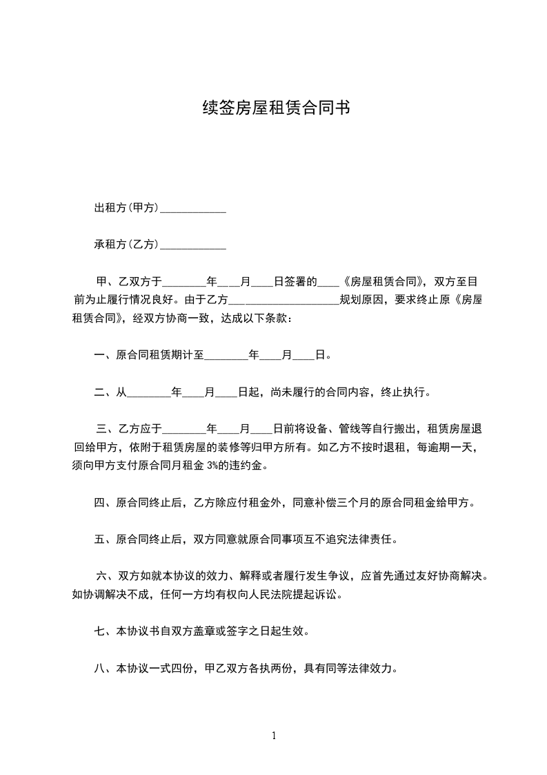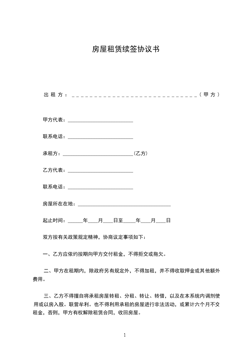 一、甲方愿意将坐落于的房屋,面积平方米,继续出租给乙方,乙方也愿意继续承租该房屋。
