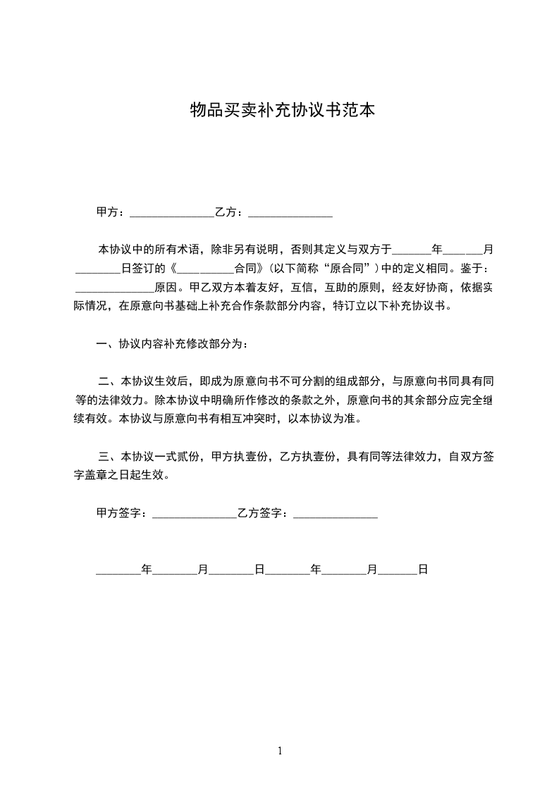 货物买卖合同补充协议范文