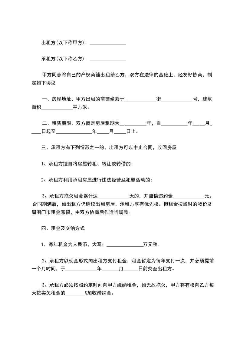 第一年租金为_______元人民币,大写_______圆整。第二年租金经双方协商约定_________________.租金支付方式_________________.