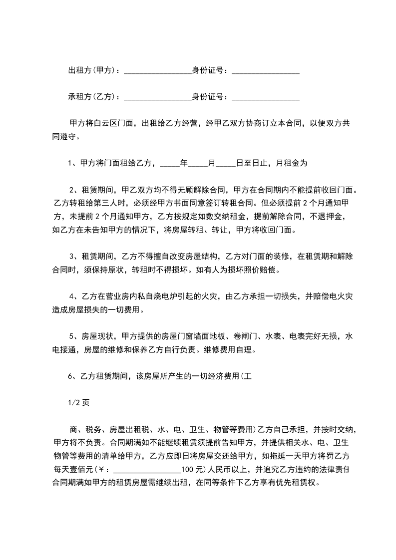 1.甲方将其合法拥有的座落于________街_______招待所以_____门面房小间出租给乙方用于经营。该门面建筑面积共_______平方米;