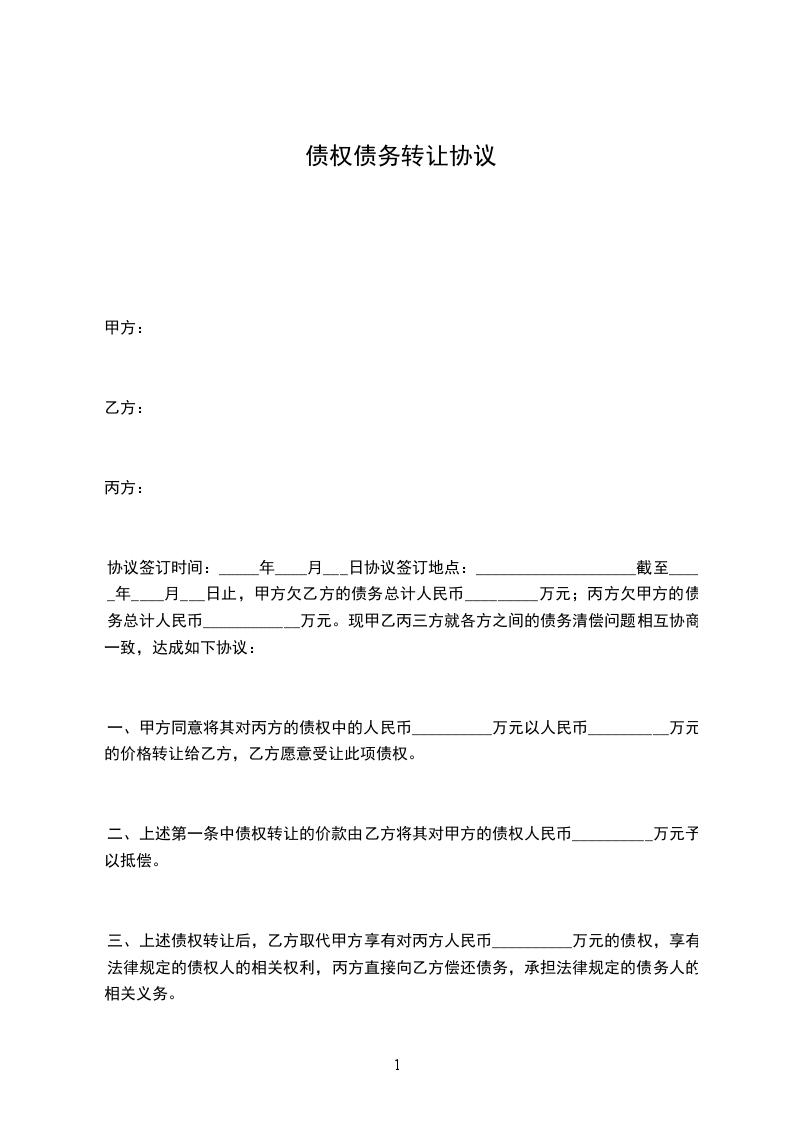 一、甲方同意将其对丙方的债权中的人民币__________万元以人民币__________万元的价格转让给乙方,乙方愿意受让此项债权。